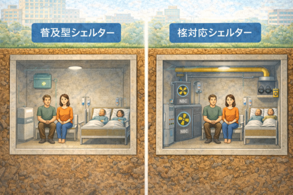 災害や危機状況に備えるシェルターの選択は、多くの方にとって重要な課題です。本記事では、普及型と核対応シェルターの違いを徹底的に比較し、それぞれの特性や適した用途を明らかにします。まず前提として、シェルターの基本的な目的や想定されるリスクの違いについて解説し、守れるもの・守れないものの実情や価格差が生まれる背景を理解していただきます。次に、性能や設備の詳細な違い、特に正圧やNBCフィルターの有無、気密性と構造の差に注目し、非常時の生活可能日数の考え方も紹介します。さらに、家庭や企業、医療法人など目的別に最適な選び方の判断軸を示し、関西地方の特有リスクを踏まえた選択ポイントや、核シェルターと普及型シェルターの二段構えの意義についても触れます。これを読むことで、安心して選択できる知識と具体的な解決策を得られます。未来シェルターは、あなたの安全を最優先に、地盤や災害リスクを熟知したご提案をお約束します。