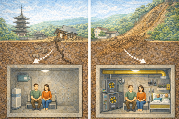 気密・正圧・NBCフィルターを備えた当社の核シェルターは、構造的にこの「地中拘束」のメリットを最大限に活かし、震動が伝わりにくい設計となっています。これにより、地震による衝撃波や爆風だけでなく、都市で懸念される長周期震動も最小化され、居住者の安全を確保します。さらに、その構造体は、衝撃波・爆風の構造的軽減に加え、地下の衝撃吸収層や免震技術を併用し、長期的な耐震性を実現しています。これらの技術的根拠は、関西沿岸の地震や奈良盆地の揺れに対しても有効性が高く、私たちの備えは着実に進化しています。