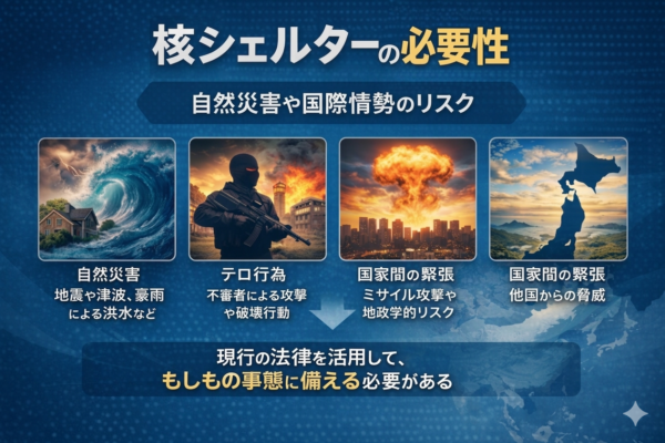 日本国内において核シェルターは、様々な視点から議論されていますが、具体的な専用法は存在しません。しかし、核シェルターの必要性や設置の検討が進められている背景には、社会的なリスクや国際情勢の影響があるのです。