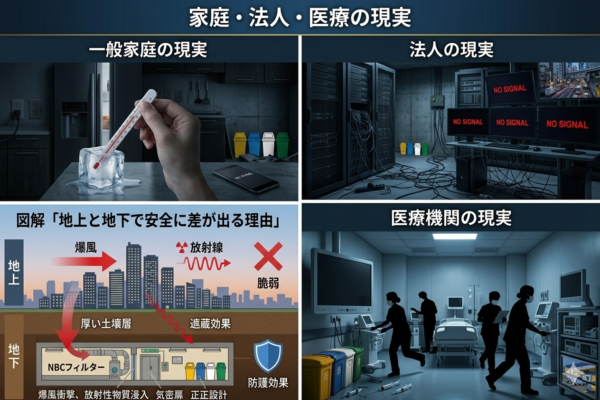 このように、家庭や医療機関、企業においては、EMP攻撃による影響が多岐にわたり、生活や業務に深刻な障害をもたらすことがわかります。これらのリスクを軽減するためには、事前の備えやシェルターの整備が重要な要素となるでしょう。