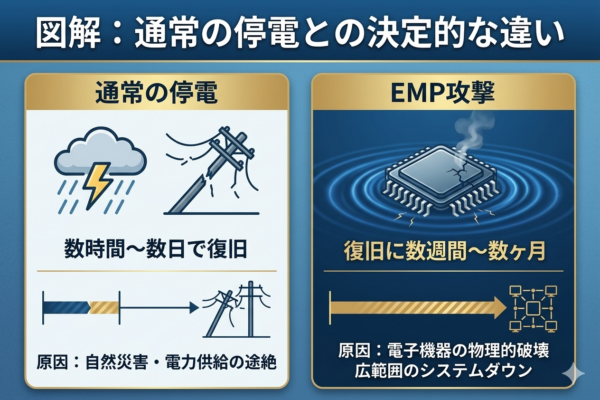 EMP攻撃による影響は、通常の停電とは根本的に異なります。通常の停電は、主に電力供給の途絶や自然災害によるものであり、その回復には通常数時間から数日を要します。しかし、EMP攻撃は、いわゆる「電磁パルス」が発生することで、電気回路や電子機器に直接的な損傷を与え、復旧にも数週間から数ヶ月かかる場合があります。特に、デジタル機器が普及している現代社会においては、多くの機器が影響を受け、結果としてインフラの広範囲な停止が懸念されます。