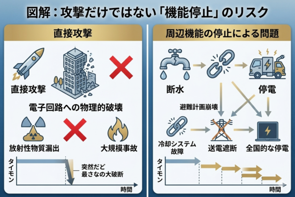 とはいえ、直接攻撃のみに注目するのは不十分です。原発の安全性は、その周辺機能にも大きく依存しています。冷却装置や電源、物流など、これらの機能が停止することで、原発内の冷却システムが正常に機能しなくなり、放射性物質の管理が難しくなることもあります。例えば、停電による冷却装置の停止は、深刻な事故につながる可能性があるのです。
