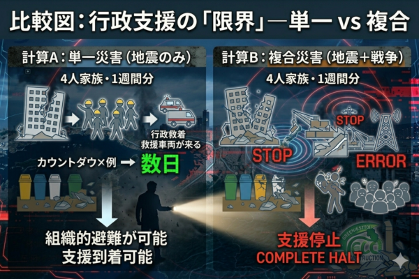 地震と有事が重なる状況では、物理的な被害と心理的な緊張が重なり、住民の避難や救助活動が非常に困難になります。電力や通信インフラが同時に停止することで、情報提供が遅れ、混乱が生じるリスクが高まります。また、物流も途絶えるため、医療品や食料の供給が滞り、非常時の対応が後手に回る可能性が高まります。