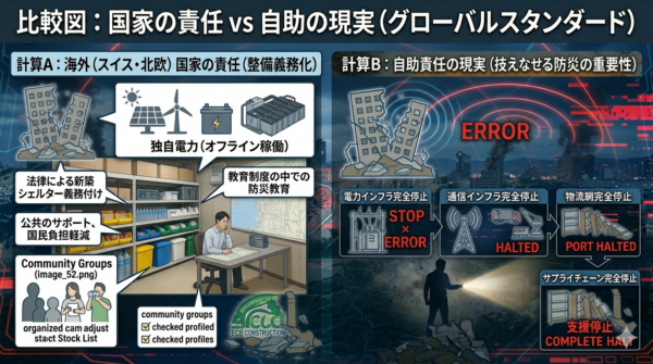 日本の避難施設の整備状況は、海外、特にスイスや北欧諸国と対比すると様々な違いが明らかになります。これらの国々では公共の避難設備が整備されており、その背後には特有の文化や制度が存在します。本章では、なぜ日本と海外で避難施設の整備に差が出るのか、その理由を探ります。